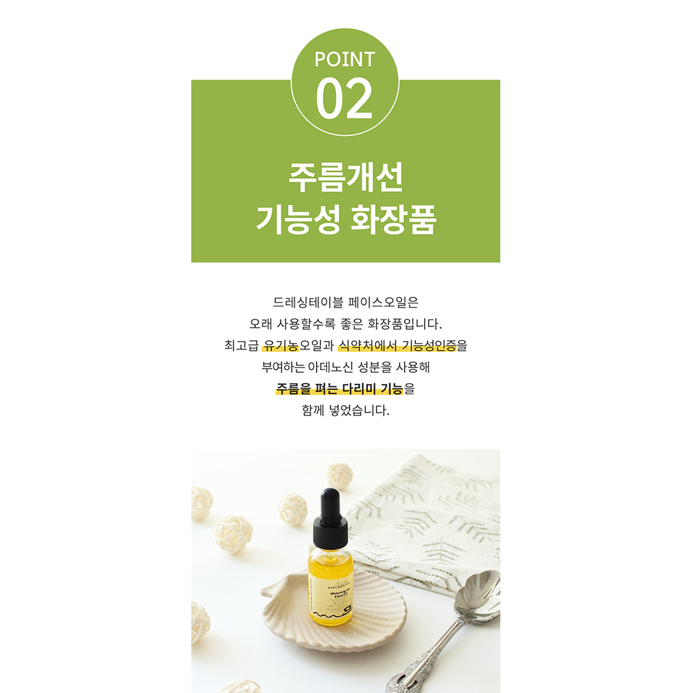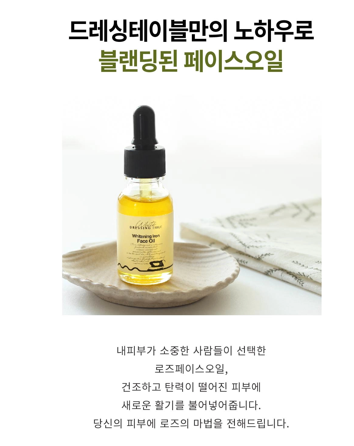 Formulated as a wrinkle-improving functional cosmetic, DRESSINGTABLE Brightening Iron Face Oil combines high-quality organic oils like jojoba seed oil and damask rose oil with adenosine, a clinically recognized ingredient that reduces fine lines and improves skin firmness.