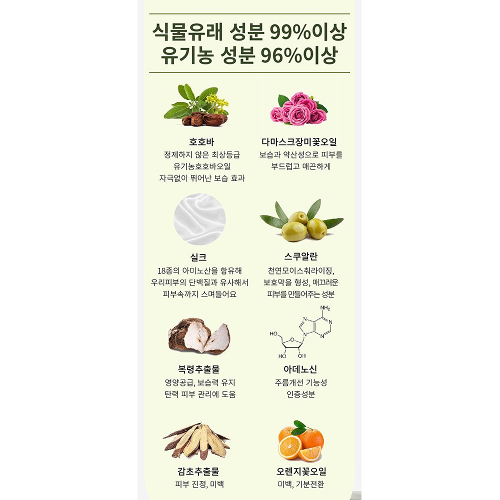 Jojoba Seed Oil, Squalane, Bokryeong Extract, Silk Extract, Licorice Extract, Red Ginseng Extract, Adenosine, Butylene Glycol, Tocopherol, Centella Asiatica Oil, Bitter Orange Flower Oil, Damask Rose Flower Oil (Organic Ingredient, #COSMOS Certified)